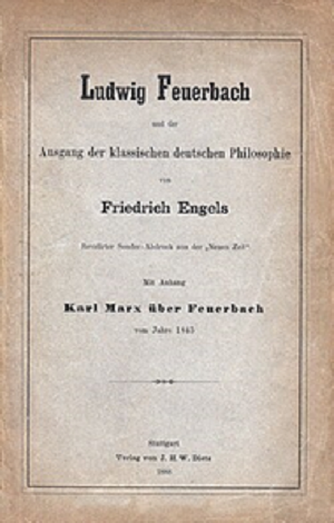 Engels priča: Vendar sem enajst tez o Feuerbachu, natisnjenih v dodatku, našel v starem Marxovem zvezku. To so zapiski za kasnejšo predelavo, napisani na hitro, nikakor niso namenjeni objavi, a neprecenljivi kot prvi dokument, v katerem je položen briljanten kal novega svetovnega nazora. London, 21. februar 1888. Friedrich Engels