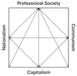 V področju ekonomije in politike se spopadajo štiri sile: kapitalizem, komunizem, nacionalizem in »profesionalna družba«. Temelje kapitalizma kot »kozmopolitičnega« gospodarskega sistema je spodkopal predvsem nacionalizem. (Šercar, 2025b)