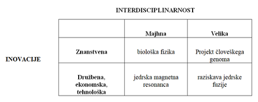 Slika 3: Shematski prikaz razmerja med vrstami interdisciplinarnosti in vrstami inovativnosti (v poljih podan tipičen primer) (Rinia, 2007)